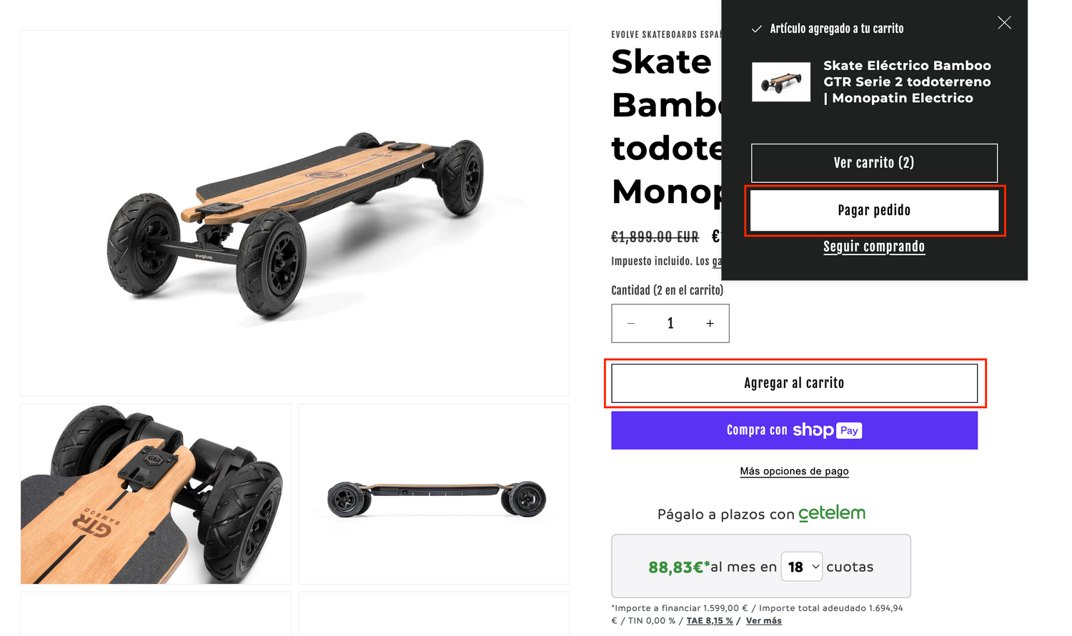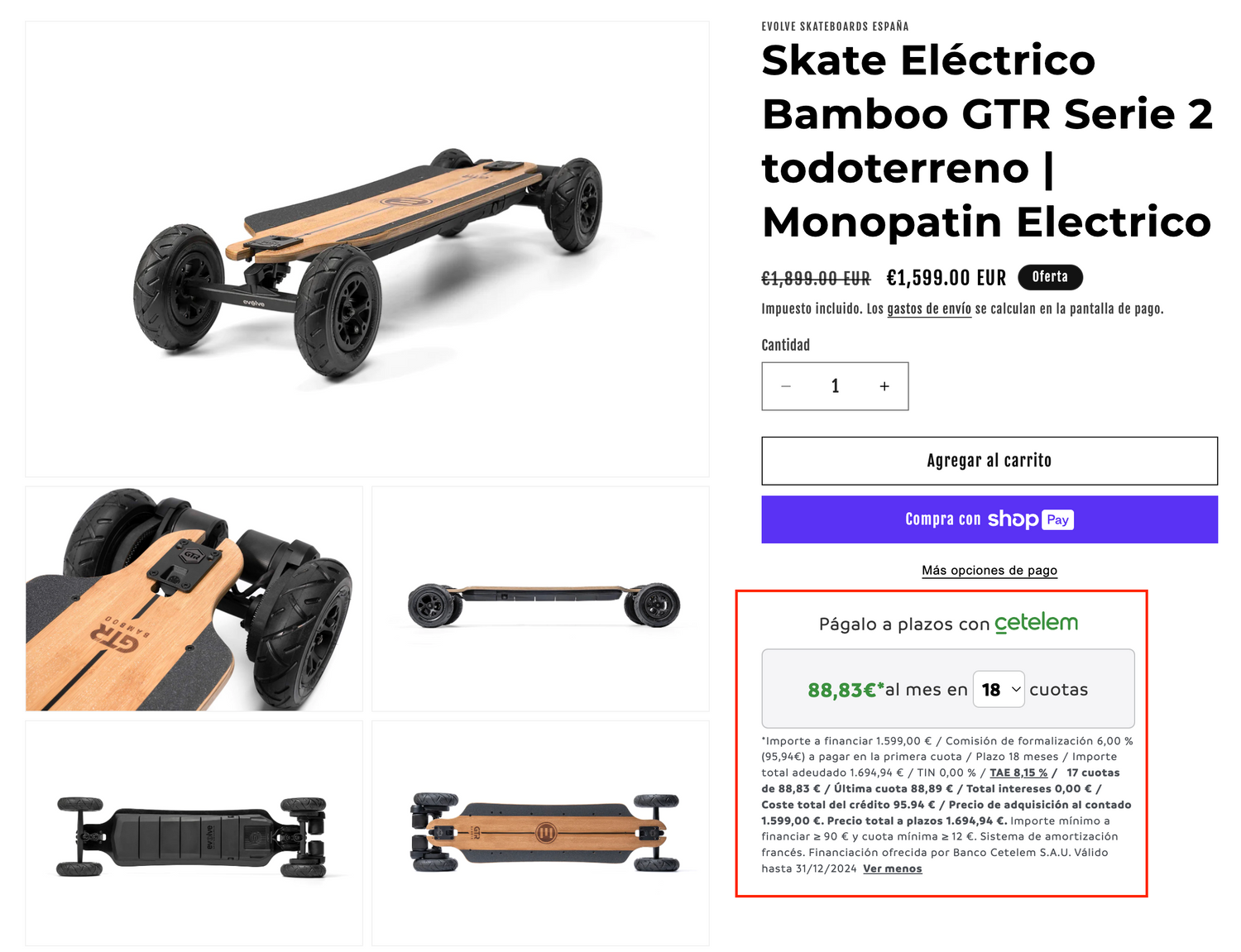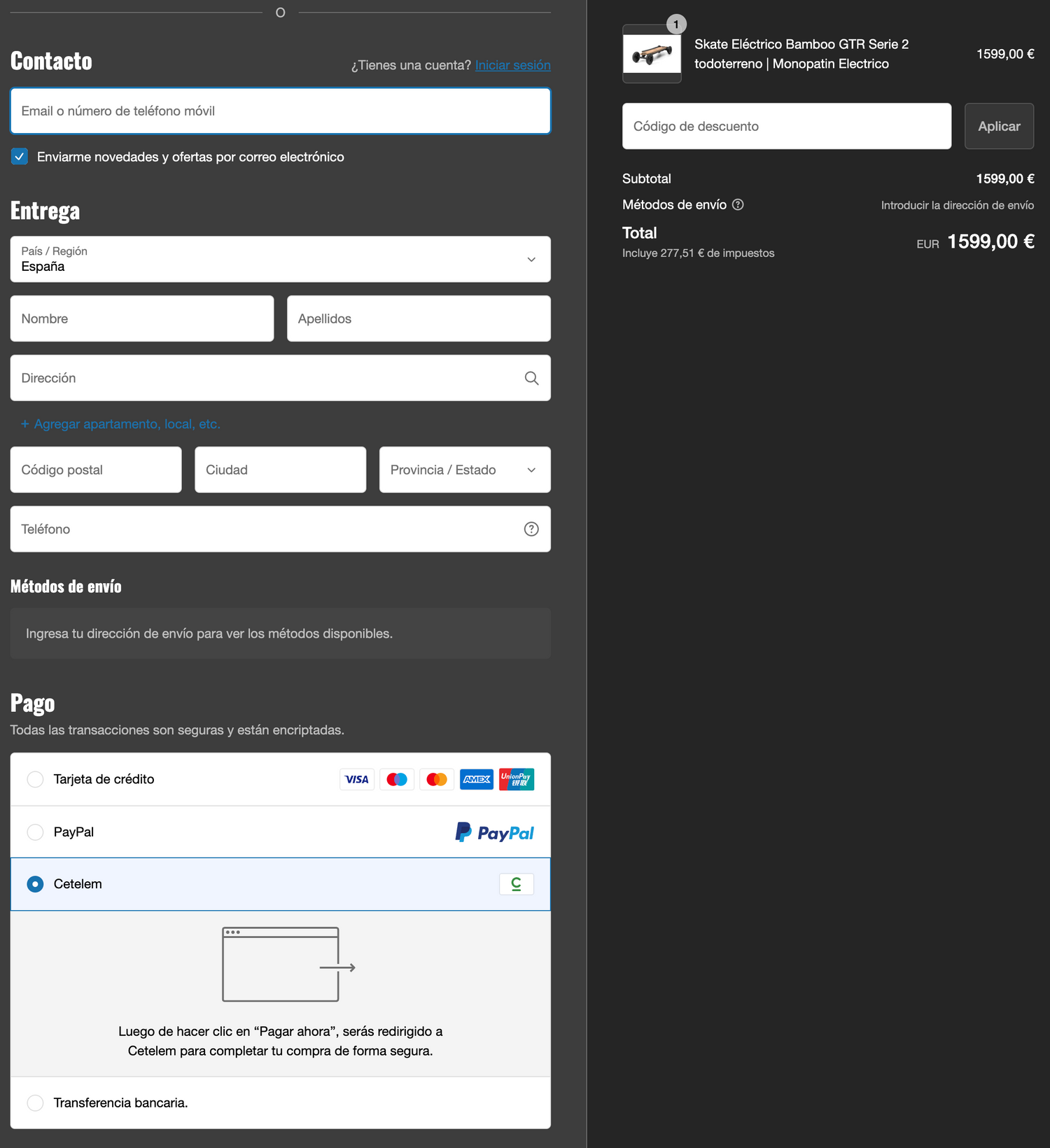 Rellena todos los datos que se solicitan y en la forma de pago selecciona 'Cetelem'. Este te redirigirá a la pantalla de financiación de Cetelem donde deberás rellenar los datos que se soliciten y subir la documentación que precisen. En ese mismo instante sabrás si estás pre aprobado. Una vez finalices todo el proceso, deberás esperar de 24-48h que Cetelem revise tu solicitud. Si es aprobada te llegará un correo y nosotros prepararemos tu Skate de inmediato =D